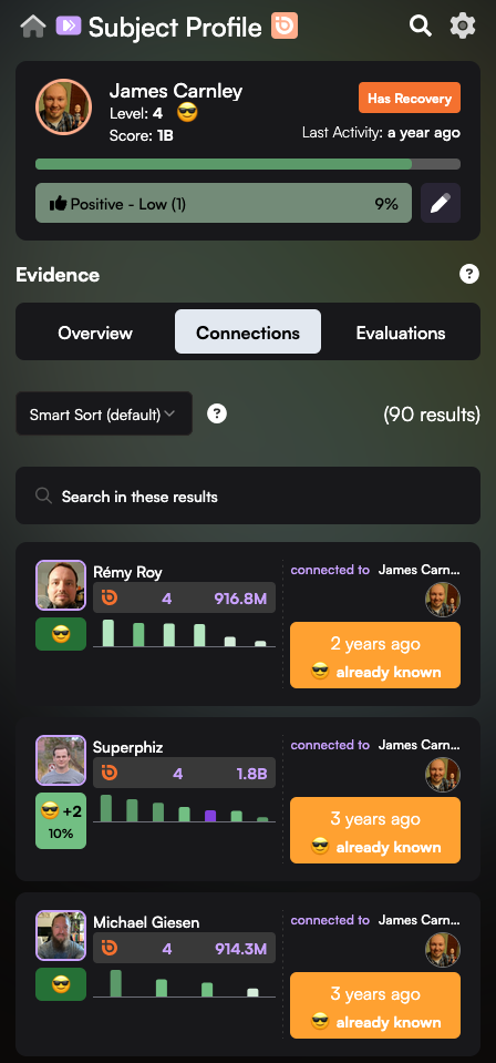 Players look at the connections they have in common with the person they're evaluating and ensure that the ones they would expect to see are actually there. The "Smart Sort" default filter for the Connections tab of a Subject Profile shows people that both you and the subject already know at the top of the results list.