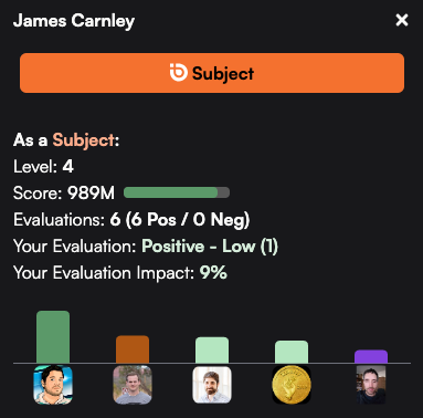 The impact bar chart shows the relative impacts of a person's evaluators on their score. It's often accompanied by the number of positive and negative evaluations they've received. Some evaluations might not have any impact if the evaluator is new or has a low score; no bar will be shown in this case.